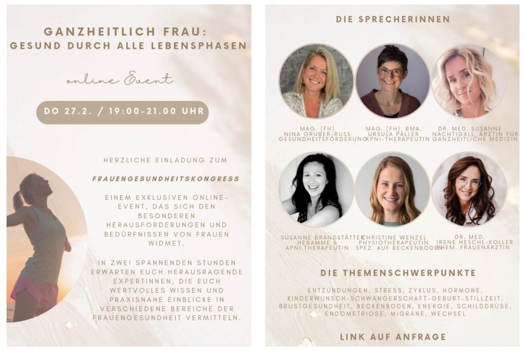 27.02.2025 @ 19:00 – 21:00 – Herzliche Einladung zum Frauengesundheitskongress! Einem exklusivem Online-Event, das sich den besonderen Herausforderungen und Bedürfnissen von Frauen widmet. In zwei spannenden Stunden erwarten euch herausragende Expertinnen, die euch wertvolles Wissen und praxisnahe Einblicke in verschiedene Bereiche der Frauengesundheit vermitteln.