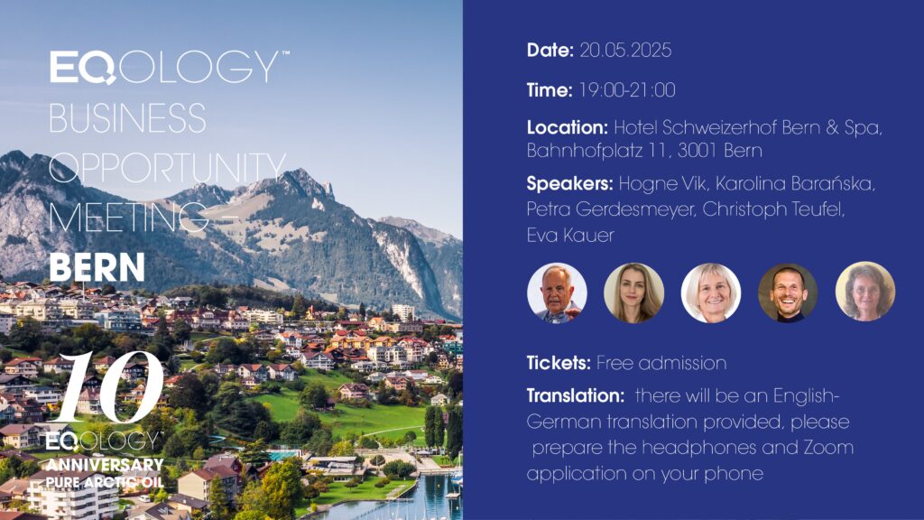 21.05.2025 @ 19:00 – 21:00 – Entdecken Sie das Potenzial von Network Marketing und erfahren Sie mehr über die Chancen einer Zusammenarbeit mit der Firma Eqology, dem Experten für hochwertige Omega-3-Fettsäure Produkte aus dem arktischen Meer. Hier wird eine Englisch-Deutsch-Übersetzung bereitgestellt. Bitte halten Sie die Kopfhörer bereit und nutzen Sie die Zoom-Anwendung auf Ihrem Telefon.