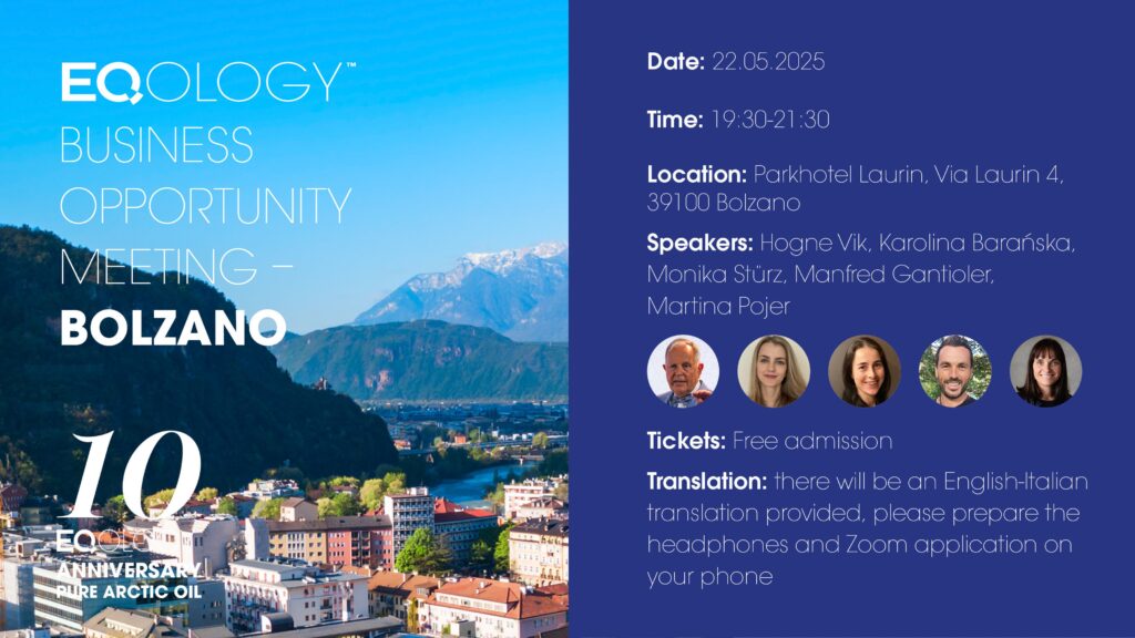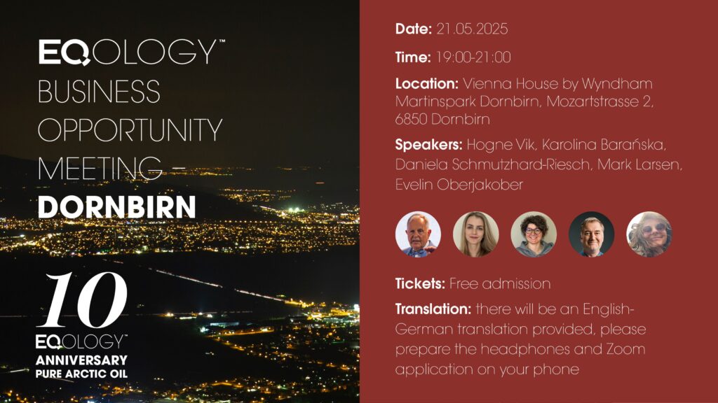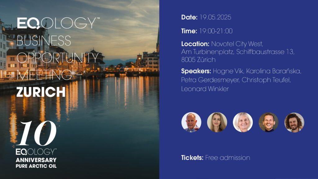 20.05.2025 @ 19:00 – 21:00 – Entdecken Sie das Potenzial von Network Marketing und erfahren Sie mehr über die Chancen einer Zusammenarbeit mit der Firma Eqology, dem Experten für hochwertige Omega-3-Fettsäure Produkte aus dem arktischen Meer. Hier wird eine Englisch-Deutsch-Übersetzung bereitgestellt. Bitte halten Sie die Kopfhörer bereit und nutzen Sie die Zoom-Anwendung auf Ihrem Telefon.