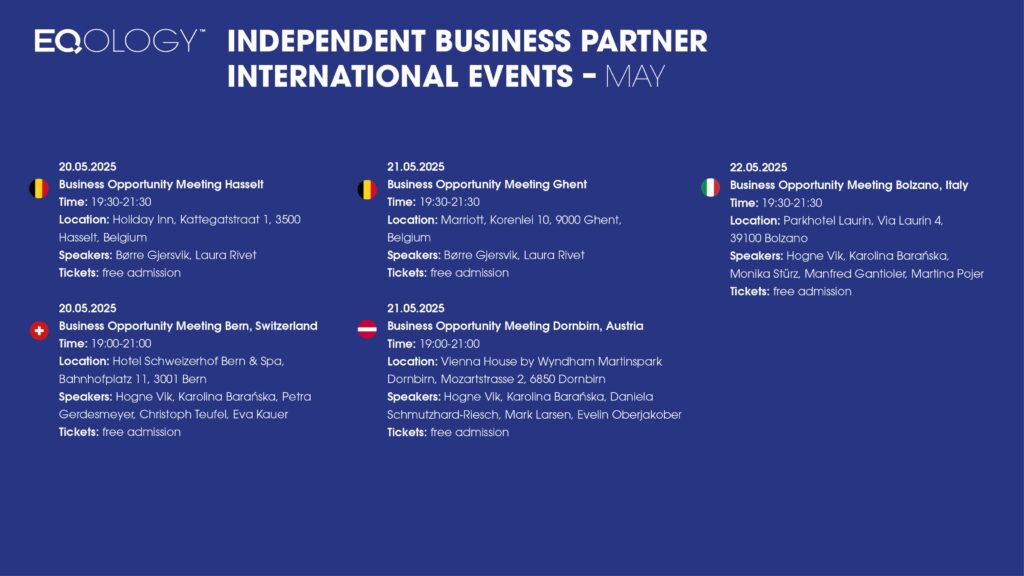 19.05.2025 @ 16:00 – 21:00 – Entdecke das Potenzial von Network Marketing und erfahren mehr über die Chancen einer Zusammenarbeit mit der Firma Eqology, dem Experten für hochwertige Omega-3-Fettsäure Produkte aus dem arktischen Meer. Vor dem Business Opportunity Meeting, welches von 19-21 Uhr stattfindet, findet für bestehende BPs von 16-18 Uhr ein Business Partner Training statt. Deine Gesundheit und dein Erfolg […]