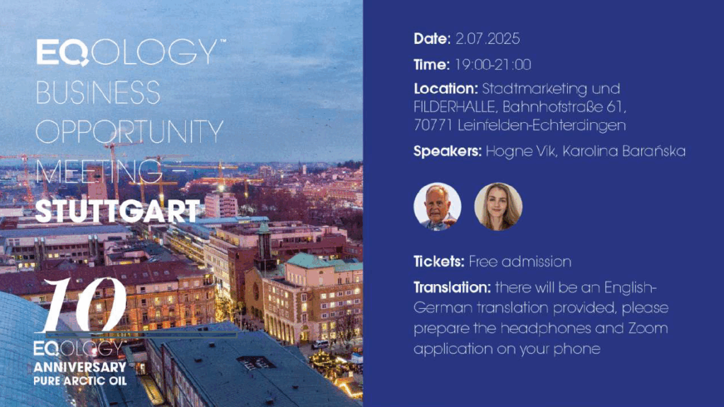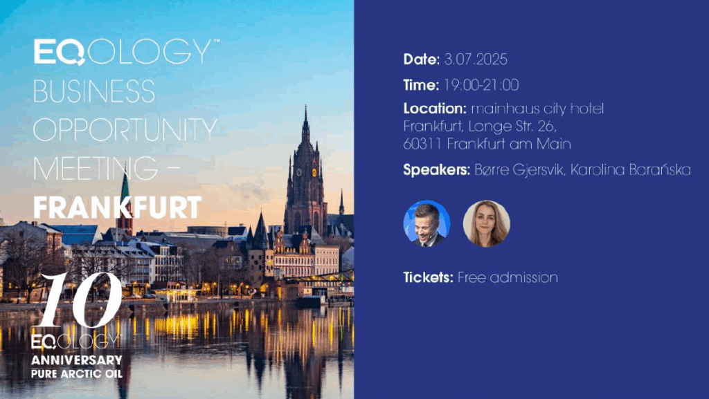 03.07.2025 @ 19:00 – 21:00 – Business Opportunity Meeting – Frankfurt am Main Entdecken Sie das Potenzial von Network Marketing und erfahren Sie mehr über die Chancen einer Zusammenarbeit mit der Firma Eqology, dem Experten für hochwertige Omega-3-Fettsäure Produkte aus dem arktischen Meer.