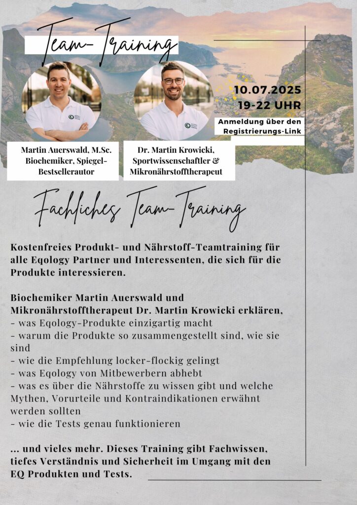 10.07.2025 @ 19:00 – 22:00 – Am DO, 10.7. von 19-22 veranstalten Dr. Martin Krowicki und Martin Auerswald das alljährliche und sehr beliebte fachliche Team-Training. Es wird viele Aha- und Oho-Momente und rauchende Köpfe geben😀 Das Ziel ist, Fachwissen zu vermitteln, aber auch Sicherheit im Umgang mit den Produkten. Für Menschen, die sich für die fachliche Seite hinter den EQ-Produkten interessieren […]