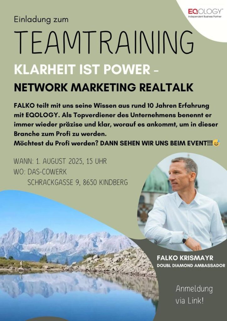 01.08.2025 @ 15:00 – 17:00 – 15.00 Uhr Teamtraining mit Falko Krismayr Aus organisatorischen Gründen bitte ein (kostenloses) Ticket unter folgendem Link buchen: https://shop.eventjet.at/de/bom/event/d682be14-503b-4feb-84c5-298cbcbe943d Dieses Training bietet dir die perfekte Gelegenheit, dich zu vernetzen, frische Ideen zu sammeln und die richtigen Werkzeuge an die Hand zu bekommen, um dein Business nachhaltig zu skalieren. Weitere Veranstaltungen im Anschluss: 18.00 Uhr Gesundheitsvortrag – […]